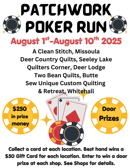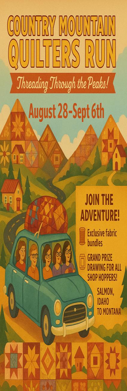 I was in the middle of modifying a dress that I made for my niece, when I came across this meme on facebook. It was so fitting for me. Garment making is a rarity for me and I think this is why: quilts always fit. If I make a twin size quilt (according to the dimensions on the pattern), it will fit a twin size bed; but when I made a size 6 dress (according to the pattern) for my size 6 niece, it did not fit. Thankfully, I was able to modify it and now she can wear it. I may dabble in garment making a bit more, but I just think quilts are more my niche. How about you? Whichever it is, we thank you for keeping us open by shopping with us!Sarina We are participating in two shop hops this month!! The first is starting now: Please note that we are closed Sundays and Mondays, so the last chance to shop with us during this shop hop is Saturday, August 9th. The second is: This will be a fun shop hop from Salmon, ID, to western MT.