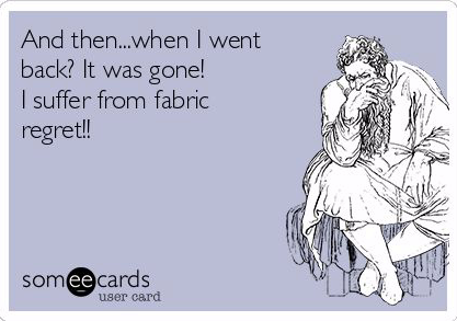 When I first started my quilting journey, I didn't understand why my coworkers would buy a fabric just because they loved it. I thought all fabrics could be re-ordered, so what was the rush to buy it? Well, they burst my bubble and informed me that when it's gone, it's GONE. Sure, there are a few exceptions, but for the most part fabrics get replaced by new fabrics. And while I do like that there are always new fabrics coming out, it is sometimes hard to watch a beloved fabric go out the door for the last time. Even worse is when you thought you bought enough of a fabric, but either had an OOPS or a new idea for that fabric, and so you go back to get more but it's gone. This is when we have "fabric regret." Very rarely does "fabric regret" mean: I regret buying it - no it is: I regret that I didn't buy it or that I didn't buy more of it. Protect yourself from "fabric regret." Buy the fabric. You'll thank us later ;-)Thank you for being our customers!Sarina